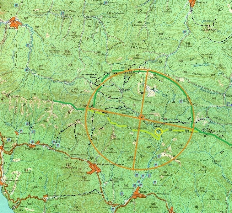 Итак, в чем же секрет образовавшейся здесь миллионы лет назад аномальной зоны? Без сомнений это особенный природный рельеф местности. Аналитики НИИ установили (смотрите карту), что вся зона (оранжевый круг на карте) находится в плотном горном полукольце, которое образует Главный Кавказский Хребет (ГКХ – зеленая линия на карте), проходящий от горы Родниковая (921 на карте), хребет Каменнистый Шпиль, перевал Папайский, весь массив горы Папай (от Западного до Восточного), вершину горы Пшада, Воровской хребет, хребет Вал и выравнивающийся в свое нормальное направление у вершины горы Большой Афипс. Надо отметить, что такая большая подкова в ГКХ (7-8 км в радиусе) нашими аналитиками вычислена, как вторая по величине на участке от Анапы до Кардывачского горного узла. Первое место занимает трехлистная подкова Красной Поляны (Ачипсе-Лаура-Пслух). Эта аномальная зона менее изучена и еще предстоит ее тщательное исследование. Также существуют относительно маленькие аномальные подковы между хребтом Хазарова и Почепсухой, с Почепсухи до Лысой через Агой, Бекишей и скалами Ходжаш и т.д. Их влияние ощущали на себе многие проходившие в перечисленных маршрутах.