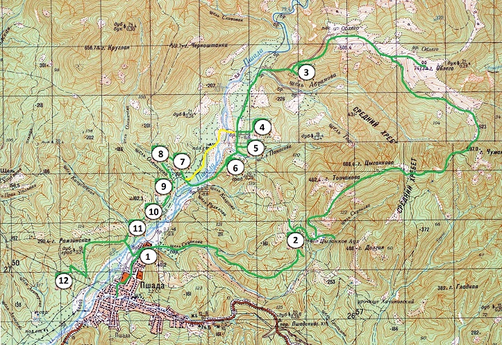 Вернемся к «Папайско-Пшадской аномальной зоне». С юга зону подпирают продолжение ГКХ горы Тхаб и Молдаванская и хребет Вал с вершинами 621 и 709 (светло зеленая линия). Единственным естественным входом в зону является узкое горлышко по руслу реки Пшада в месте слияния с рекой Папайка (желтый круг на карте). Это место также известно, как ущелье трех скал – Приступина, Скаженная и Церковная.
