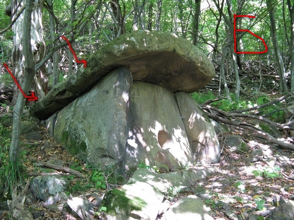 На рисунке А видно : внизу пяточный камень ;паз в боковой плите; контрфорс боковой плиты .Несмотря на то что дольмен находится на довольно экстремальном склоне ,он в очень хорошем состоянии ,лопнула только верхняя плита.на рис Б показано как задвигалась верхняя плита. на третьем изображении я рядом с дольменом на хребте Нихетх виден искусственный холм в который вставлены 6 дольменов.Холм расположен строго по направлению Север-Юг.