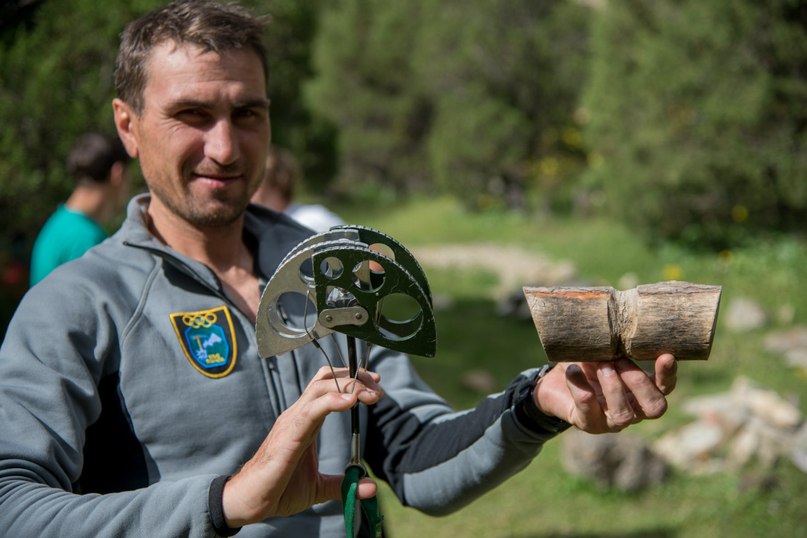 В одной руке у альпиниста современный "френд", а в другой самодельная деревянная закладка выполнявшая в прошлом те же функции для расклинивания в трещинах и обеспечения точки страховки.