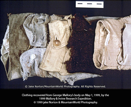 Голова и руки лежащего ничком, головой вверх по склону альпиниста были накрепко вморожены в холм из мелких камешков, накопившихся у тела за годы. Перевернуть его было невозможно. Даже просто подкопаться под него потребовало нескольких часов терпеливой работы ледорубами и карманными ножами. Срезая какую-то часть одежды, Джейк наткнулся на ярлык изготовителя, который мы отогнули и вытащили наружу, чтобы рассмотреть. Под тем ярлыком было аккуратно вышито: "Дж. Мэллори". Мы бросили все работы и уставились в лица друг друга... Однако, наши первые вопросы вертелись вокруг одного и того же: "Почему Эндрью Ирвайн носил рубашку Джорджа Мэллори?" В конце концов нас ударило: мы нашли не Ирвайна, мы нашли не "древнего мертвого англичанина" Ванга Хонг-бао. Мы стояли перед самим Джорджем Лейфом Мэллори. ЧЕЛОВЕК этой горы, иголка в стоге сена. Смелость и энергия Мэллори вызывали у нас благоговение... а сейчас мы прикасались к нему. И вдруг каждый из нас увидел мускулистые руки восходителя - после всех этих лет, Джордж Мэллори все еще имел внушительную фигуру.