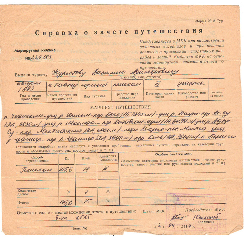По окончании спортивного похода группа или руководитель делают отчёт по пройденному маршруту и предоставляют его на рассмотрение выпустившей МКК. Она его рассматривает, и делает заключение: "маршрут засчитан такой-то категории сложности всем участникам, и руководителю". Или не засчитан. Тем, кому засчитан, выдаётся справка установленной формы, в которой записаны маршрут, вид туризма, район проведения похода, категория, маршрут, время проведения, характеристика на участника.
