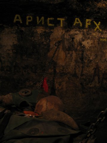 - Человеческий череп "Аристарх" лежащий на платформе цепями подвешенной к потолку - раньше там вообще целый скелет лежал, никто не знает кто это был, но ему традиционно приносят дары - сигареты, конфеты и прочие мелочи.
