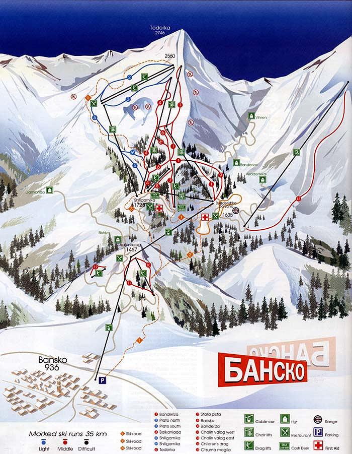 Горнолыжный отдых в Банско – это отменный сервис и прекрасная, современная инфраструктура. Курорт предлагает лыжные трассы для всех категорий лыжников, 6 трасс общей протяженностью 14 км находятся на высоте от 2500 м до 1100 м над уровнем моря. Они обслуживаются несколькими подъемниками и фуникулерами, протяженностью свыше 7000 м, и рассчитаны на 3 тыс. пассажиров в час. Список новейших отелей, пансионов и частных апартаментов, принимающих туристов, довольно внушителен. Здесь можно подыскать вариант размещения от самого недорогого до очень высокого уровня. Горнолыжный курорт Банско признан самым инвестируемым и быстроразвивающимся горнолыжным курортом Восточной Европы.