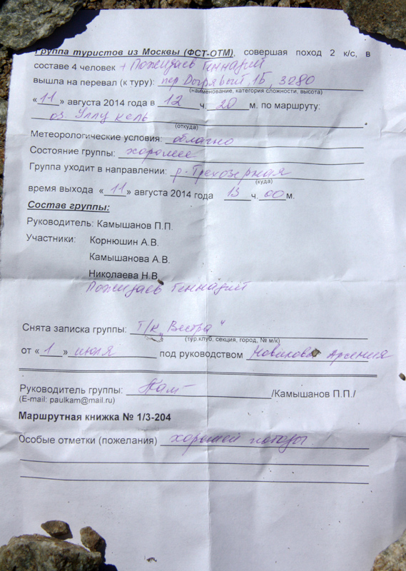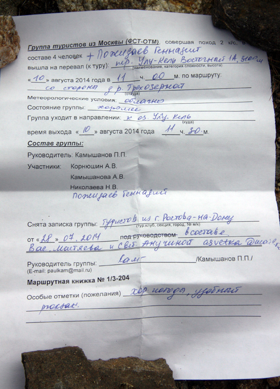 ...мы провели на озере 3 дня. Встретились с двумя группами. С Питера, 10чел школьников с девушкой-инструктором. Пришли снизу, ушли ч-з Уллу-Кёль Восточный. И 6 чел из Ессентуков. Пришли с Уллу-Кёля Восточного, ушли ч-з Дырявый. На заставе в Махаре оставляли машину. Поднимались и уходили по Трёхозёрке.