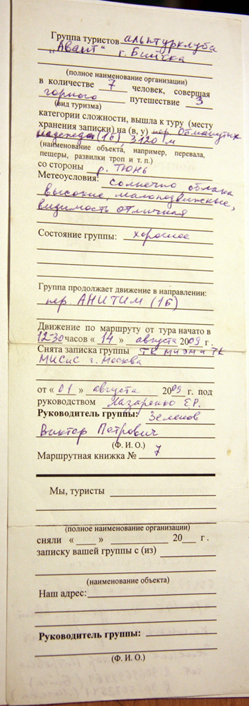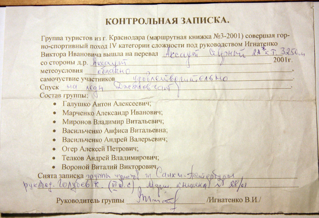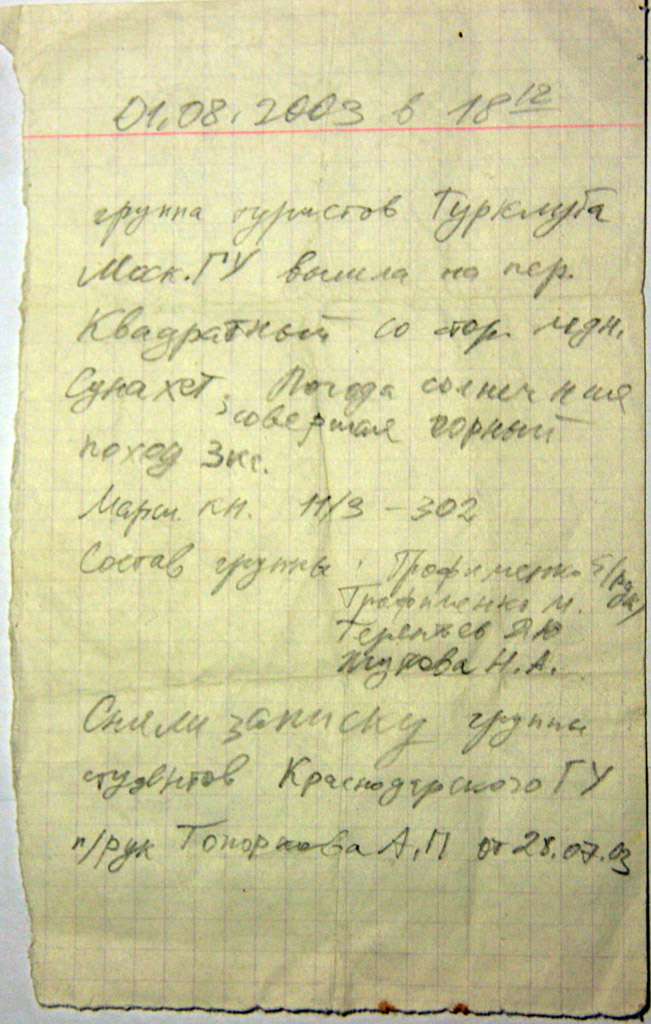 Севернее седловины Узлового есть пер. Безымянный (его ещё на старых картах подписывают как "Дьявола". И у Голубева, в фото, есть подписи "пер. Безымянный" и "пер. Дьявола" одной и той же седловины). Первой на него вылезла группа Алексея Карпова, со стороны Даута. Целились на Саламандру (кстати). Но "попали" сюда. Записку не нашли, и оставили свою, назвав седловину "Безымянный".