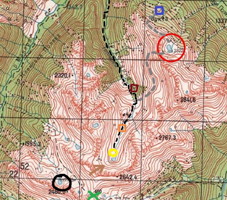 Вот добавил на карту: синий квадратик -лагерь лесорубов, темно красный квадратик -водопад, оранжевый квадратик -барикады ВОВ, желтый кружек -место нашей ночевки, коричневая стрелка -несложный перевал, зеленый крестик -некатегорийный перевал Дружба, черный кружек красивое на наш взгляд озеро которое стоит посетить (мы его видели из далека, но тучи и дождь мешали, а у нас небыло времени), черный пунктир -это наш путь, серый пунктир -вариант выхода из ущелья.