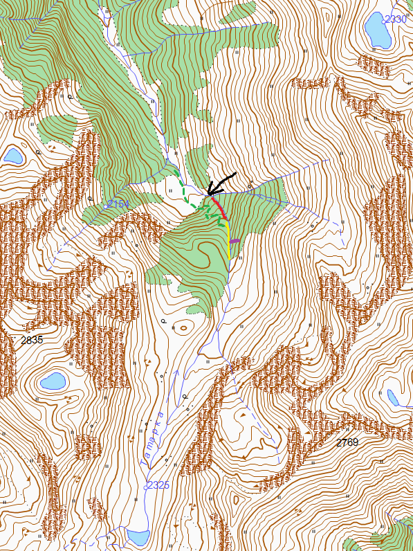 Вот, ещё немного информации: черная стрелка -водопад, красным -непроходимый каньон с водопадами, желтым -проходимый каньон, фиолетовым -это красивый водопадик который вытекает из горизонтальной стены и впадает в каньон Татарки (мы по ниму спускались), зеленый пунктир -обход водопада и каньона.