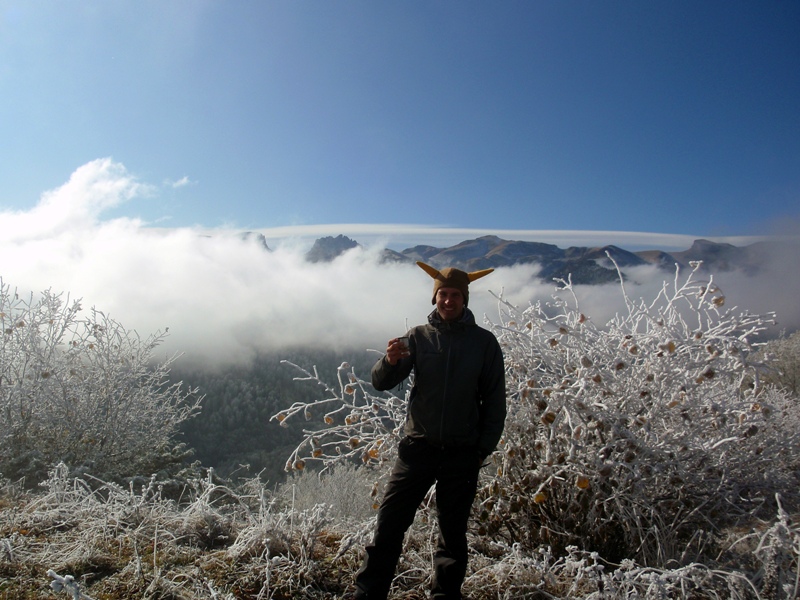 На второй день налегке пошли искать пути подъема на Западный Ачешбок (в прошлом году с Восточного Ачеша, западный выглядел неприступной скалой))). Попробовали по горельнику, вышли на скалы. Потом решили на сыпухе попытать счастье, и оно нас нашло. Так и поднялись. Только выползли на вершину, как ветер заметал тучи, дав нам с удовольствие пообедать и насладится видами. Сняли записку Светы (Ansv) от 5 ноября прошлого года)) Т.е. не сняли, просто ознакомились, с собой не было ручки чтобы оставить след. После обеда переждав ливень в палатках, погуляли по окрестностям (сбегали на пещеры что на скалах вдоль Шишы) и на панорамную седловинку Восточного Ачеша.