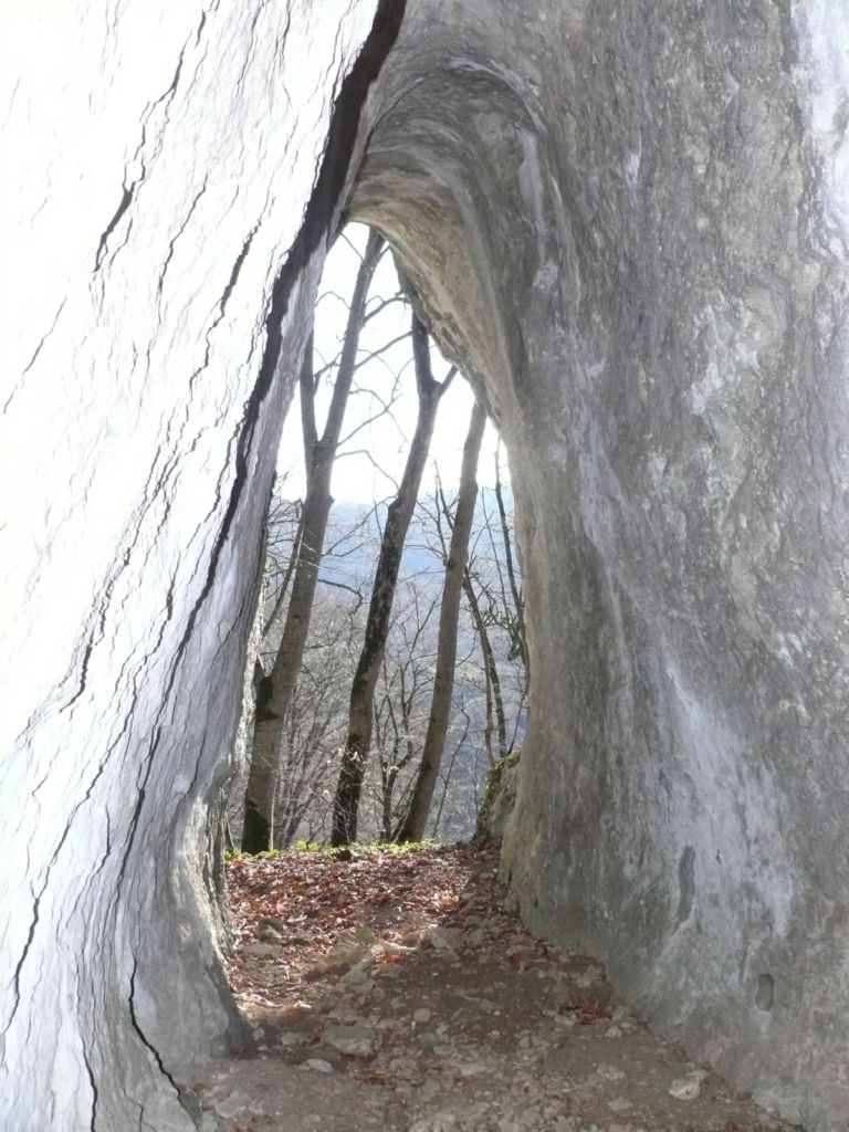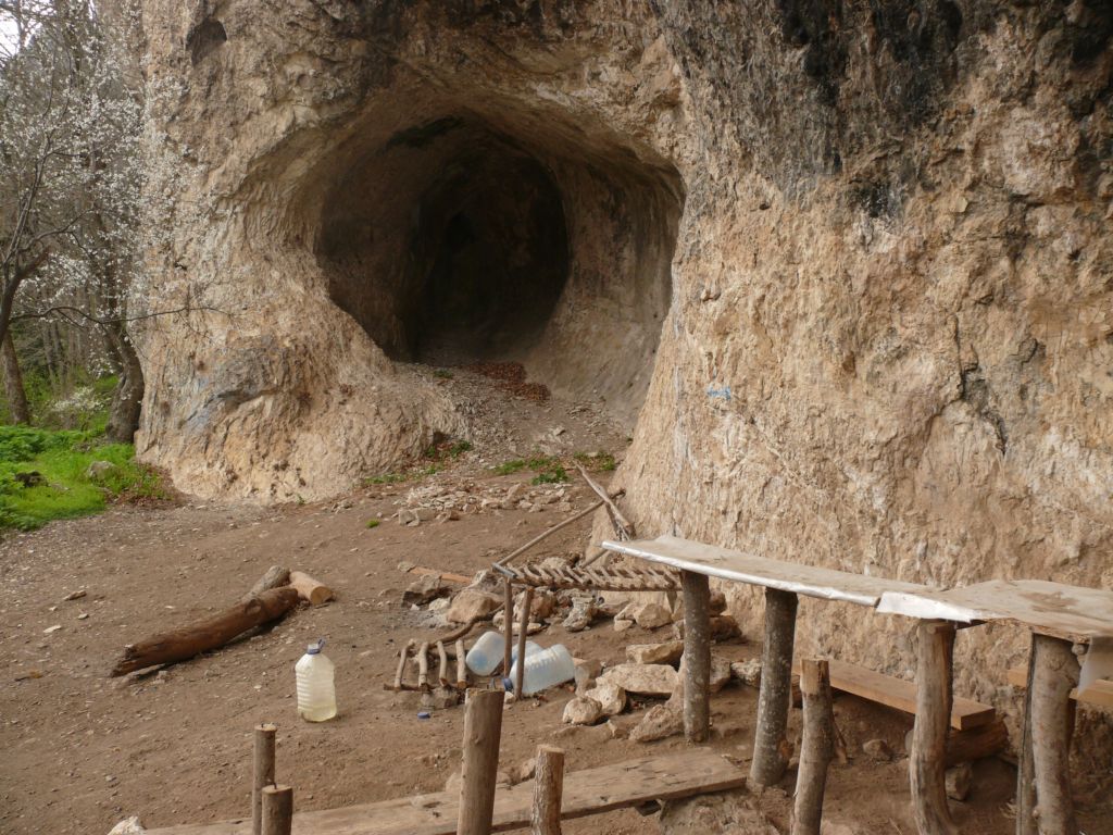 От отворота на водопад надо пройти еще метров 100 и искать старые волоки с синей маркировкой вверх (маркировка нанесена на тонкие деревца возле основной дороги и очень плохо заметна!!!), переходить на правые (вверх) ответвления. Дойдя до скалы идти по стрелкам (влево). Пещера - небольшое углубление в скале (метров 10-15 максимум) высотой от 3 до 6 метров. Вид открывается очень красивый. Вообще здесь очень красивое ущелье, хоть и довольно широкое по сравнению с тем же Гуамским. Дальше вдоль скалы - огромный грот (по моим оценкам метров 10 - 12 глубиной и 8 - 12 высотой). Везде копали археологи - остались ямы. Скалы из гипсов очень сильно закарстованы. Часто скалы имеют розовый окрас, что весьма редко встречается. Расположены под высотой 907,0 м.