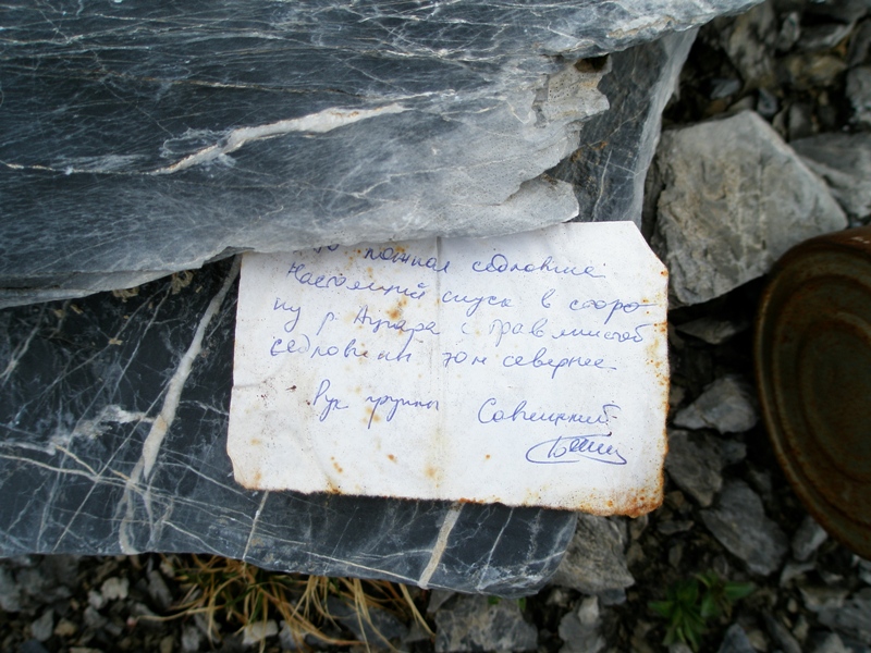 Благодаря Савчинскому мы в 2009г узнали, что Золотое Дно - хитрый перевал, с ложной седловиной, откуда нет спуска. В том месте,где сложен тур, тогда лежало еще одно послание от него(сейчас в том туре ничего обнаружено не было). Привожу фото той записки тоже.