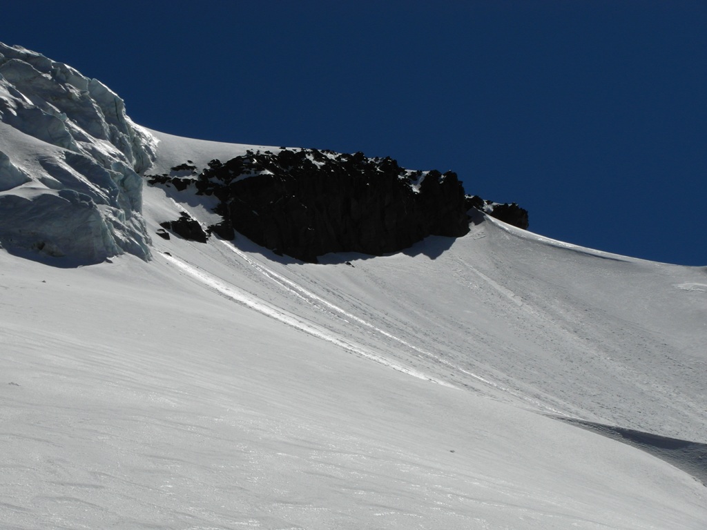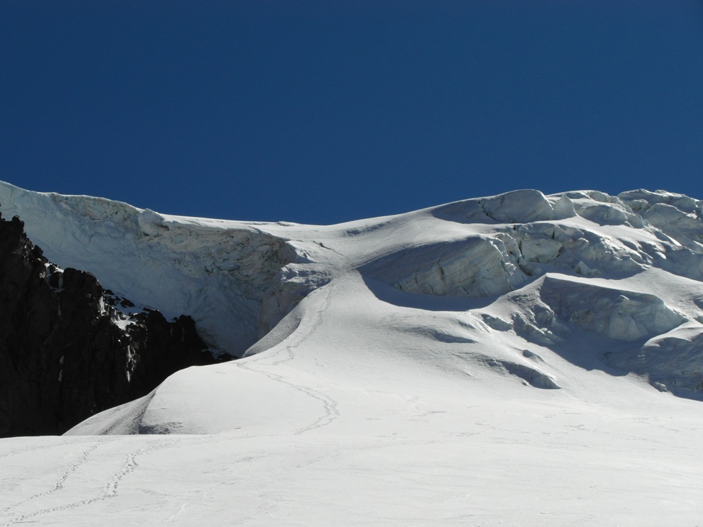 Дошли только до ледопада, а там лед под тонким слоем подтаявшего снега, снизу казалось что снег. Пройти не успели, снизу поползла облачность. Спустились на ночевки на 4200. Сделали там дневку. Стали присматриваться к обходному маршруту через Носик, там довольно сильно сыпит.