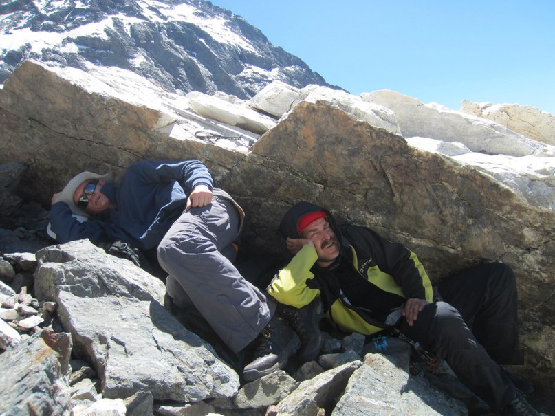 В самом конце спуска пошли по турам и вышли в такое место, где удобно было только спускаться по склону, но мы оказывались метрах в ста ниже лагеря. Вверх идти уже очень не хотелось. Поэтому мы засадили свободным лазанием еще одну стену метров на 20 и вышли к палатке.
