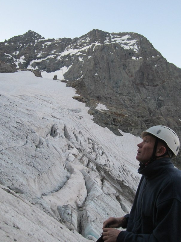 В первый день хорошо начали, прошли ледник и дошли до здоровенного жандарма (Рыжий петух). Его надо было обходить, чтобы выйти на начало хребта (маршрут).