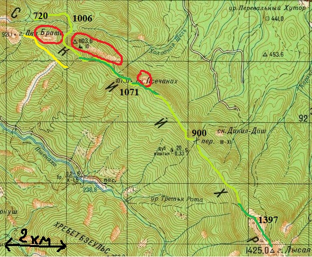 "С Двубратовской седловины начать движение в сторону выс.1103,4 по гребню хребта. Набитой хребтовой тропы на всем участке нет, но придерживаясь гребня, кусков натоптышей и зверинок все делается. Первую вершинку обходим слева и спускаемся на широкую седловину, с лесной дорогой , перепрыгивающей с юга на север, следующую "Рассыпанную" проходим по верху. Подъем на 1103,4 сначала в лоб с кучерями, а под вершиной обходя с севера. Скальные выходы на спуске тоже обходим слева. Дальше везде надо держаться гребня, разумно приспускаясь на северную (скалы Псеченах), либо южную сторону. В межсезонье проще, папоротник и ажина лежит, и местами видно подходяшие кусочки троп. Сразу к с-з от перевала Дикел-Даш в гребне хребта мощный скальный выход, не обозначенный на картах, с названием скалы Дикел-Даш, не те что показаны к востоку от перевала. При подходе к скалам начинаем плавно, по ю-з склону приспускаться под обрывающиеся на юг стены. Можно встретить сделанную в 1991 году обходную тропу, или волок. Под стенами каменная осыпь, небольшой заболоченный участок, исток единственного на всем участке ручья. (есть еще родничок на южном склоне к востоку от скал Псеченах, но на него лучше расчитывать). Здесь можно заночевать. Проходим под стенами и по старой дороге поднимаемся на заросшую полянку перевала Дикел-Даш. Дальше по гребню пользуясь заросшей тропой. Через несколько сотен метров высматриваем поднимающуюся с севера, из долины реки Пшиш дорогу, и ведущую дальше вдоль гребня к Семиглавой. Не доходя метров 100 до границы альпики справа-внизу на ю-з склоне террасы и исток ручья. Массив главной вершины Семиглавой проходится либо траверсом по гребню, либо по тропинке, обходя справа до середины, а затем поднявшися на гребень и дальше по нему. Есть один провальчик где придется чуть-чуть пролезть. На главной вершине остатки тригопункта и непризнаный народом обелиск."