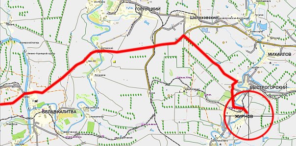 выйти на повороте на Шолоховскую (по левую сторону), по правую сторону поворот на Жирнов. До Жирнова 25 км. можно на попутке.