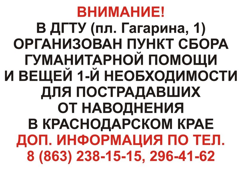 В ДГТУ организован пункт сбора помощи пострадавшим при наводенении в Краснодарском крае.