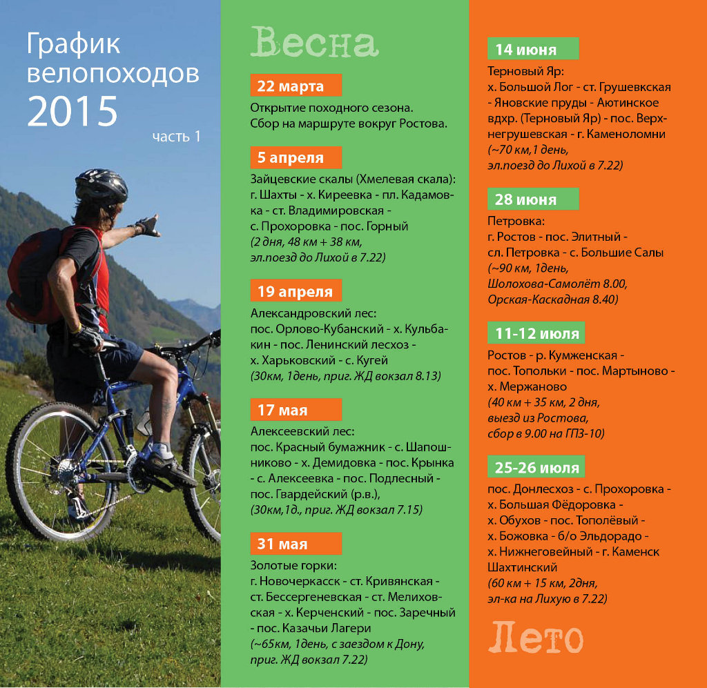 Приглашаю всех в велопоходы выходного дня. Для начинающих жедательно выдерживать принцип нарастания протяжнности от выезда к выезду. Планы ПВД такие: