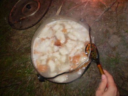 Еще приходилось быть дровосеками а потом вязанку на горбу по пресеченке тащить по очереди, мне досталась финишная прямая с рекой, чуть не утонула, блин )))))) Потом из этих дров надо было на скорость развести костер и сготовить горячую еду. А мы как назло прослушали про этот пункт и к тому моменту из еды остался только хлеб и две банки сайры. Пришлось варить омерзительную баланду. Когда принесла ее судьям, они аж поперхнулись. Спрашивают - "ЭТО ЧТО???"! Не видите? - Рыбный суп! пришлось им верить на слово, попробовать не рискнули )))) Когда уносила чан от коллегии, краем уха услышала очередное - "ЧТО ЭТО??". В ответ раздалось скромное - "МАКАРОНЫ"... Судьи - "ЕКЛМПОПРСТ... а макароны то где??". Оборачиваюсь - просто чан с водой :D Нам ишшо повезло с хавкой.