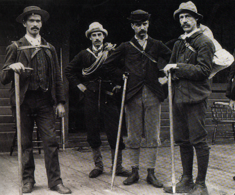 Особенно интенсивно горы Кавказа посещались в 80-90гг. 19 века. Сюда приезжали представители всех стран, культивирующих альпинизм. До сих пор вершины и перевалы хранят имена англичан Фрешфильда, Вуллея, итальянца Села. Иностранными альпинистами были покорены более 60 кавказских вершин: Ушба, Шхельда, Мамисон, Айлама, Джангитау, Дыхтау, Катын… Совершенствовалось снаряжение. Клюка прошлого века преобразовалась в альпеншток – палку с острым штырем на конце, но уже без крюка, а в середине столетья появился ледоруб – высокий, до груди альпиниста, с тяжелой кованой головкой. К концу века ледоруб приблизился к современному. Первые кошки были четырехзубые, в виде крестовины, прикручивающиеся под стопу. Их сменили восьмизубые, аналогичные современным. К концу века появились скальные крючья, которые, однако, не всеми альпинистами были встречены одобрительно.