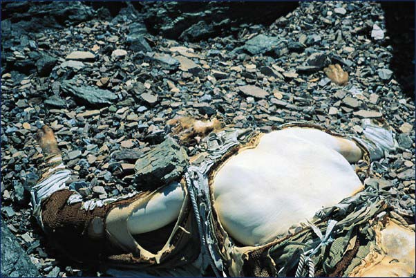 После нескольких минут фотографирования и ошеломленной тишины мы принялись за нашу работу. Рюкзаки и кислород в сторону, и мы начали искать идентифицирующие особенности и реликвии. Не думаю, чтобы кто-либо из нас, с нашими восходительскими, альпинистскими биографиями, питал бы иллюзию, что обыскивать мертвое тело являлось бы легким занятием. Однако, мы все были слегка обескуражены тем, какой трудной оказалась эта задача.