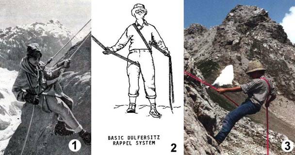 Рис.1. Одни из первых способов спуска по веревке, разработанные Гансом Дюльфером, не требуют никакого дополнительного снаряжения: