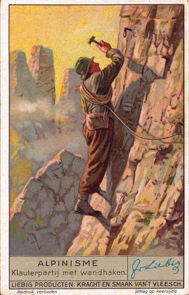 Альпинизм появляется в Европе. А именно, тот самый альпийский стиль восхождений, когда весь необходимый скарб доставлялся до базового лагеря с помощью копытных животных и разного рода прислуги, а уже оттуда горовосходители шли с тогдашним подобием штурмовых рюкзаков.