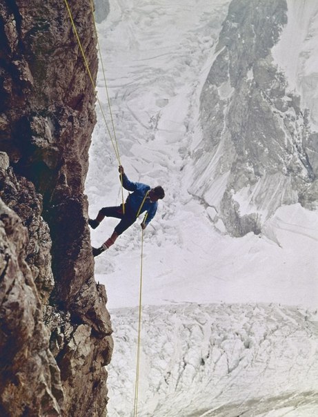 Раскопал фотографию. Советский альпинист на рубеже 1960-70 гг. спускается методом Ганса Дюльфера: