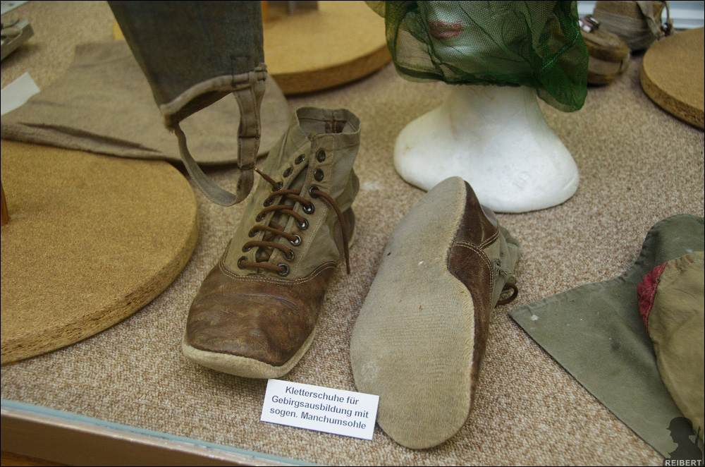 Особый интерес представляют скалолазные тапочки периода 2МВ (помним о советских галошах 1970-х гг.), туристические рюкзаки и рюкзаки горных егерей 1МВ-2МВ (можно сравнить с Абалаковским рюкзаком 1950-х).