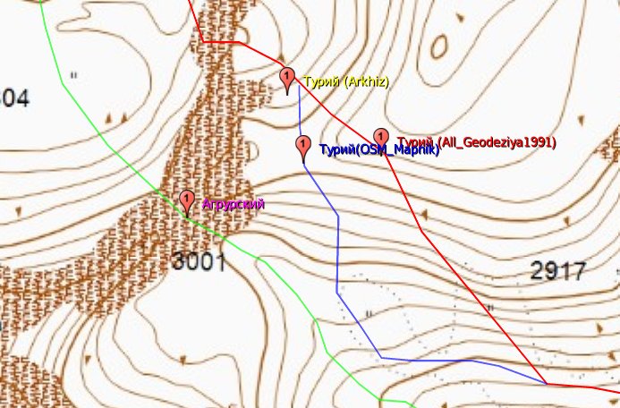 обозначение возможных маршрутов и перевала на цифровой карте проекта Open Street Map (MAPNIK), звёдочкой показано место перевала. В этом же месте, на снимках http://wikimapia.org показана трапецевидная область без подписи.