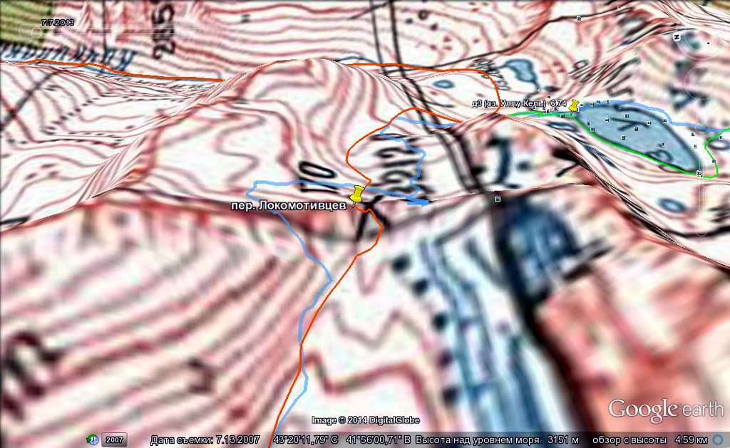 3D схема предполагаемых маршрутов через перевал Турий на топографической модели в среде GoogleEarth