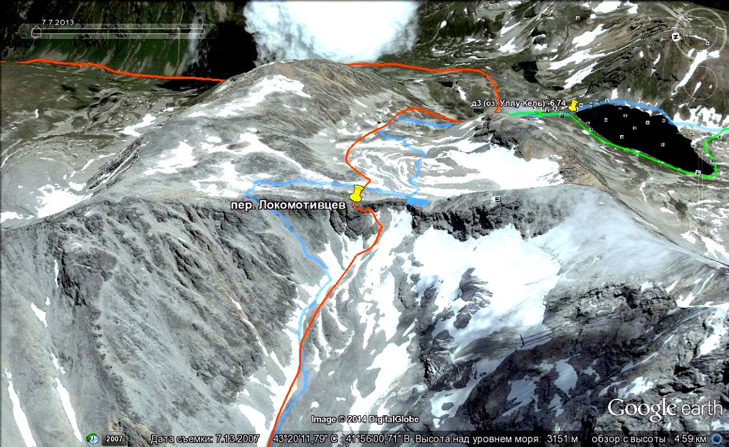 Света, как и на некоторых перевалах, по которым идут активные обсуждения на форумах (иногда при упоминании М.В. Голубева) на перевал Локомотивцев ссылаются разные люди проходящие его в разных местах (см. http://vk.com/photo5598130_309603287 и вложение). Таких места два - напрямую по центральной линии ущ. р. Джугутурлючат - односторонняя сложность - скалки, лазанье, косвенный признак сложности: петля для страховочной вервки (так ходил т/к Ковчег c запада на восток) - красная линия на прилагаемых снимках. Другой маршрут более простой - всё идётся ногами плотной группой, 350 метров севернее - осыпная седловина также отмеченная туриком (см. http://vk.com/photo5598130_309603288, http://vk.com/photo-1714033_314157381) - синяя линия, я шёл так, потому что консультировался у Назаренко В.Л. и у Гранкова М.В., и так оказалось проще.