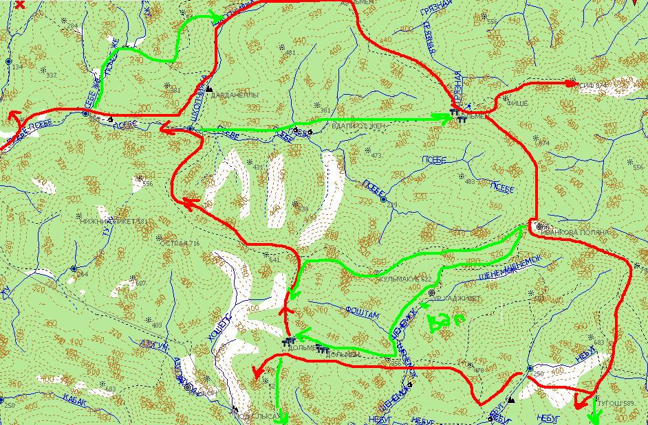 А вот на счет Почепсухи-это хорошая идея. Ходят от Молдавановки по хребту Хазарова через "подкову" на Почепсуху, а с нее спускаются и поднимаются через пер. Граничный к Фаше. За 5 дней можно пройти, но во-первых будет гонка, а во-вторых хочется стартануть именно из Псебе, т.к. на пригорке под р. Псошонок есть дольмен, который будет отправной точкой многоугольника. А также нам понадобится время на поиски вокруг г. Тугош и запас на погоду.