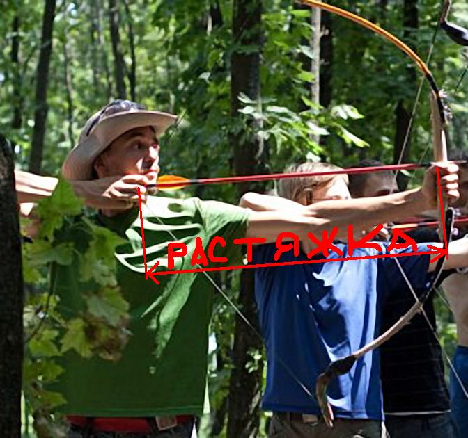 Затем вам нужно примерно узнать свою растяжку (это расстояние от рукоятки на которое вы будите тянуть тетиву) Растяжка примерно равна длине